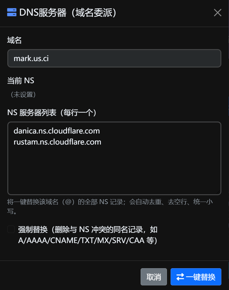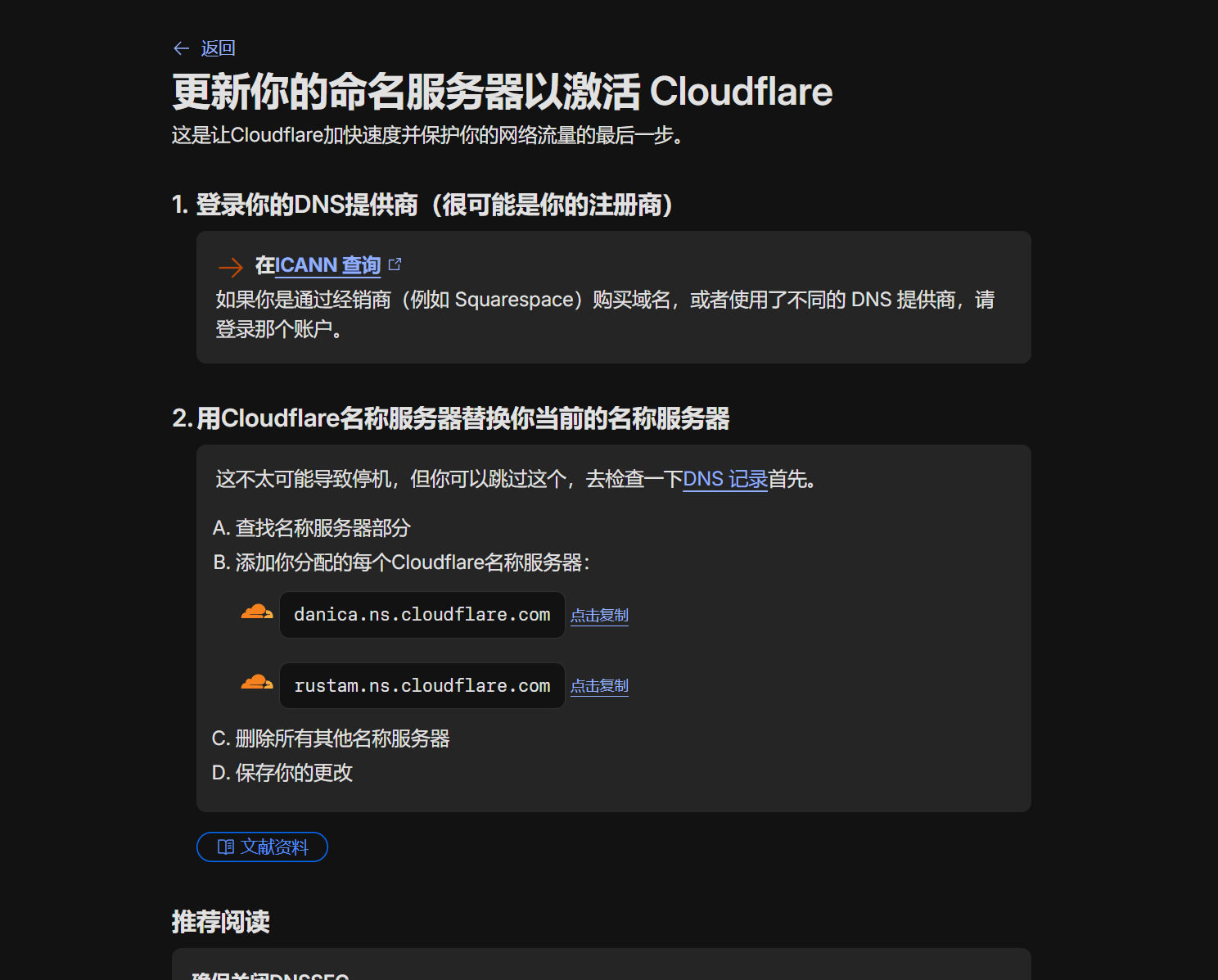 返回首页2026/3/13技术笔记免费域名创建免费域名创建 登陆网址:https://my.dnshe.com/ 可以免费创建五个域名 cloudflare托管 登录cloudflare,点击域名界面。 使用刚才注册的域名进行注册,选择免费计划即可 点击继续激活进入下面界面 将需要复制的两行添加到域名的DNS服务器 替换即可感谢阅读希望这篇文章对你有所帮助,欢迎继续浏览其他内容。浏览更多文章评论 (0)发表评论加载评论中...